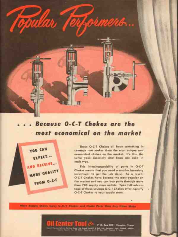 Original oil and gas trade magazine vintage ad for OIL CENTER TOOL COMPANY of Houston, TX.  Popular Performers Because O-C-T Chokes are the Most Economical On The Market. Unique 1954 old oilfield petroleum well industry equipment magazine advertisement. Great graphics.