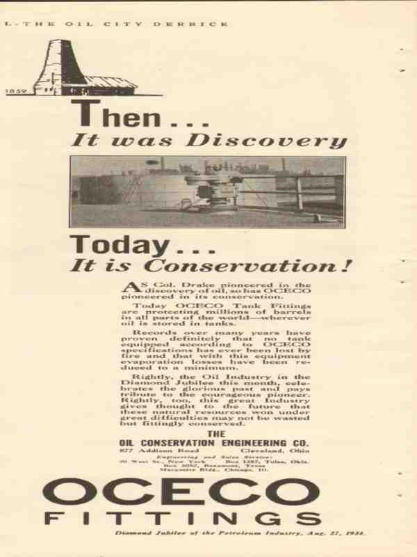 Original oil and gas trade magazine vintage ad for THE OIL CONSERVATION ENGINEERING COMPANY, was located at 877 Addison Road, Cleveland, OH. Then It Was Discovery, Today It is Conservation! OCECO Tank Fittings are protecting millions of barrels in all parts of the world, wherever oil is stored in tanks. This old 1934 fractional page magazine advertisement would display beautifully matted and framed.