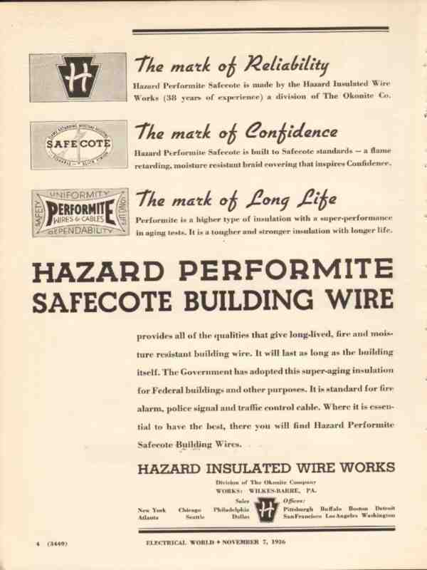 Original old industrial trade magazine ad for THE OKONITE COMPANY of Wilkes-Barre, PA. Hazard Performite Safecote Building Wire provides all of the qualities that give long lived, fire and moisture resistant building wire. This 1936 industry magazine advertisement would display beautifully matted and framed.
