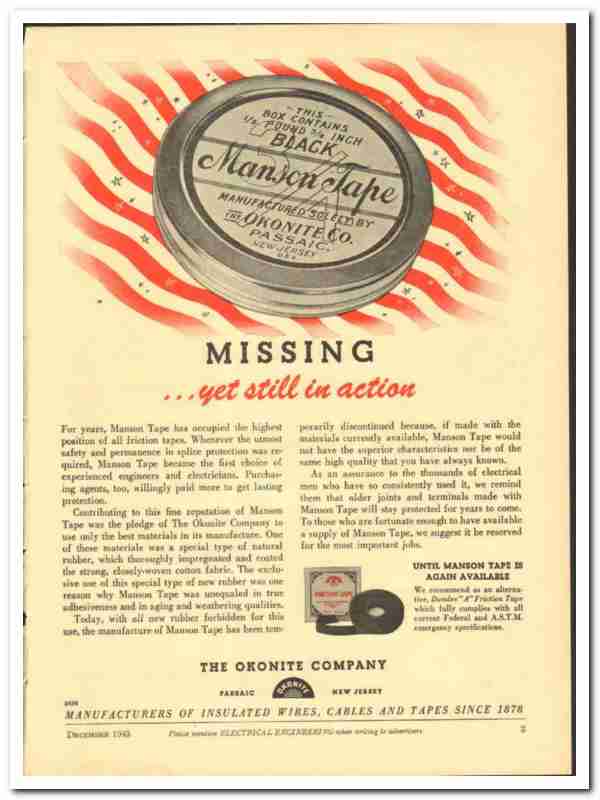 Okonite Company 1943 vintage electrical ad Manson Tape missing