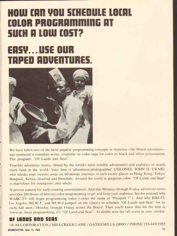 Original vintage broadcasting industry trade magazine ad for OLAS CORPORATION of Gates Mills, OH. Use Our Taped Adventures. Of Land and Seas. True-life adventure stories hosted by Colonel John D. Draig. WABC-TV, KHJ-TV Los Angeles, WLW-T, and WLW-I. Old 1965 television broadcasting industry advertisement.