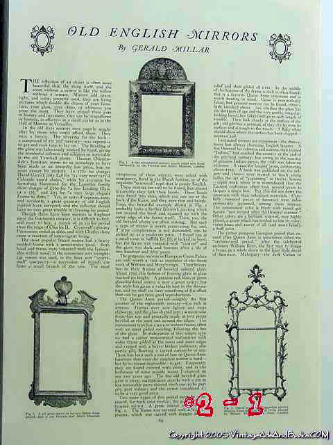 Original vintage magazine article OLD ENGLISH MIRRORS by Gerald Millar. Late seventeenth century mirror inlaid with floral marquetry, a gilt gesso mirror of the late Queen Anne period, Chippendale mirror owned by Messrs. M. Harris & Sons, glass bordered mirror made by T.H. Ball & Co., a wall sconce reproduced by T.H. Ball and Co. Old 1926 country home magazine article. 2 pages