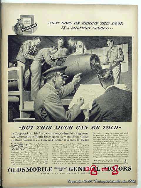 Original vintage magazine ad, OLDSMOBILE. "What Goes On Behind This Door is a Military Secret" Division of General Motors. Keep 'Em Firing! World War II, WWII, WW2 Old 1943 Word War 2 GM advertisement. Would display nicely matted and framed.