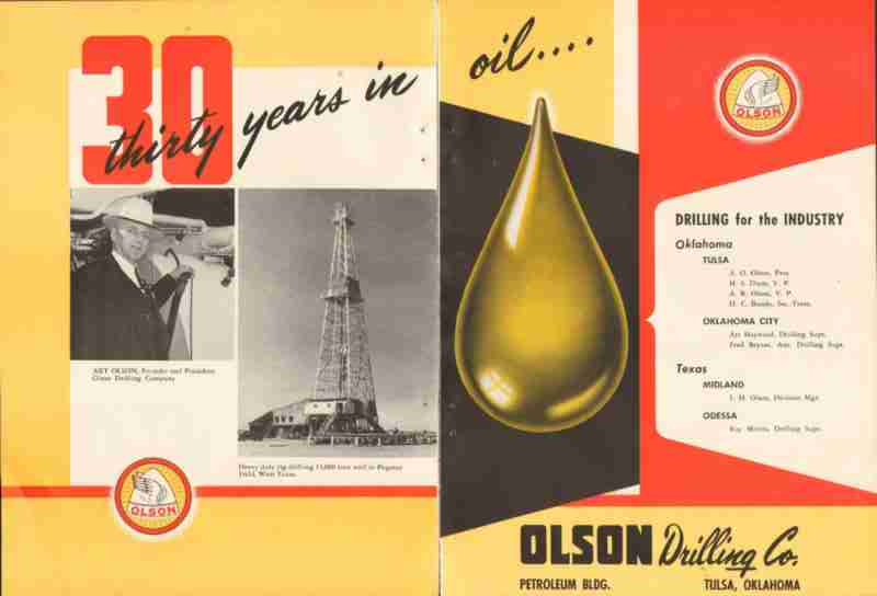 Original oil and gas trade magazine vintage ad for OLSON DRILLING COMPANY, was located Petroleum Building, Tulsa, OK. Mr Art Olson, Founder and President. 30 Years in Oil. This unique 1951 old oilfield petroleum well drilling industry magazine advertisement would look sensational matted and framed. Nice graphics. Two page gatefold advertisement.