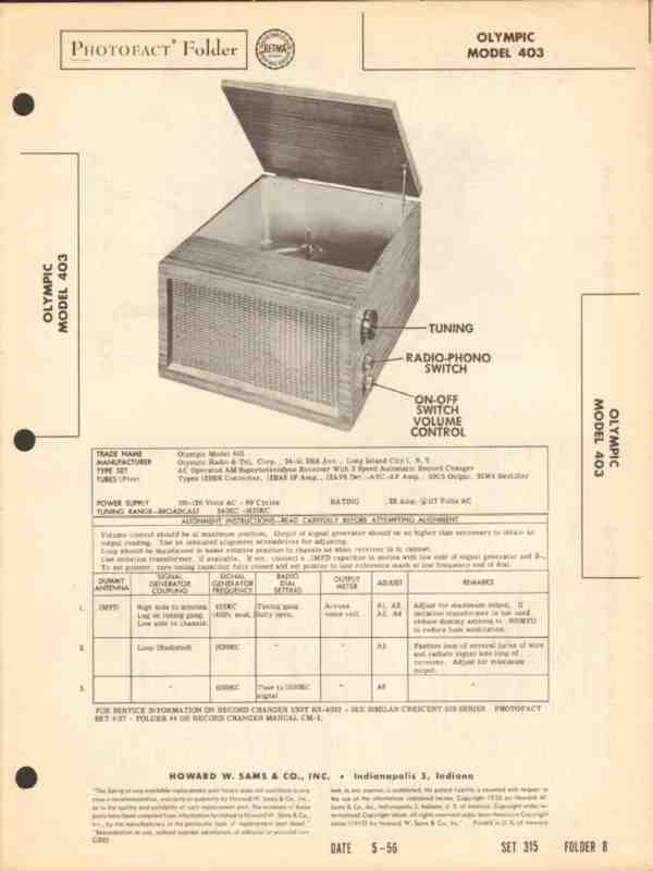olympic model 403 am radio receiver phonograph sams photofact manual