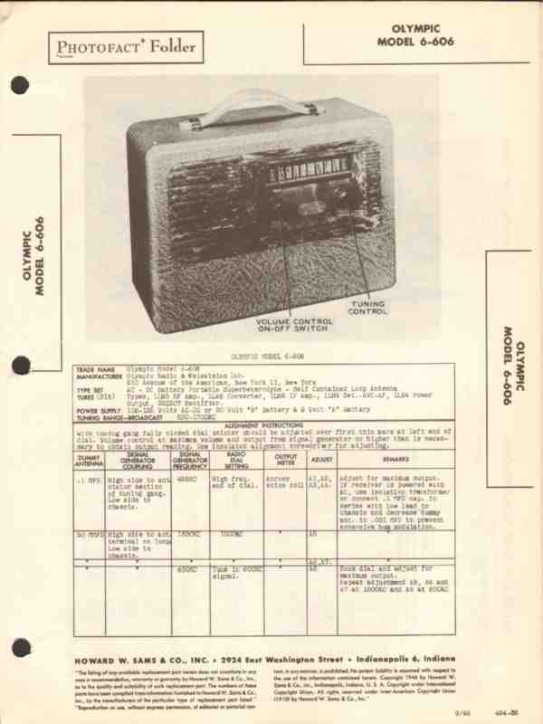 Vintage OLYMPIC model 6-606 Superheterodyne portable AM radio receiver. Original old Sams Photofact manual includes schematic, layout, alignment instructions, voltage & resistance test charts, repair parts list and description. Dated 1946. 4 pages. Olympic Radio & Television Corp., of New York, NY. This manual would make a sensational accompaniment to your classic retro radio equipment.