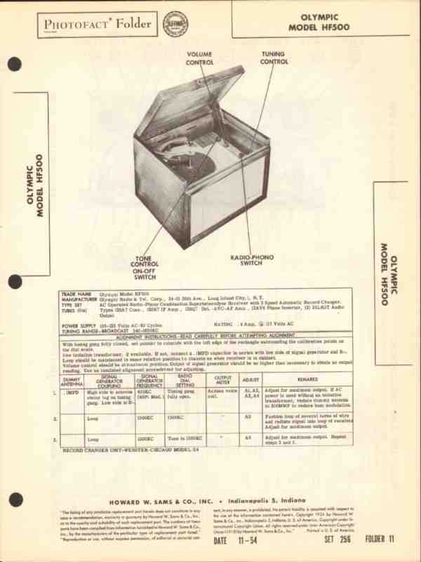 Vintage OLYMPIC model HF500 6 tube Superheterodyne AM radio receiver with 3-speed automatic record changer phonograph. Original old Sams Photofact manual includes schematic, layout, alignment instructions, voltage & resistance test chart, repair parts list and description. 4 pages. Dated 1954. Olympic Radio & Television Corp., of Long Island City, NY. This manual would make a sensational accompaniment to your classic radio phono equipment.