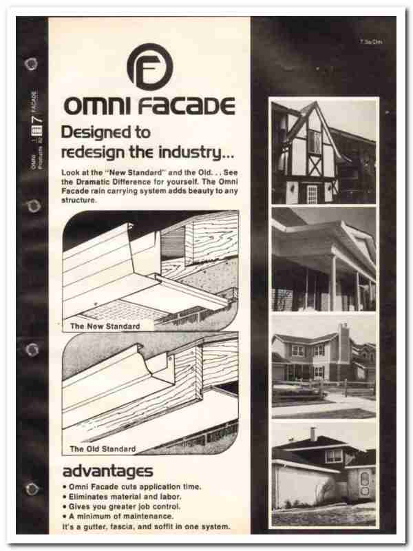 Original roofing trade vintage catalog for ONMI PRODUCTS, INC. Main office was located at 1540 West Fullerton Ave, Addison, IL. Manufacturers of Omni Facade rain carrying system, adds beauty to any system. Look at the New Standard and the Old. Measuring & installing and application are discussed, finishing off the gable cheeks are illustrated. Components also shown. Unbound from a large 1982 architectural catalog, this unique old four page technical brochure would display beautifully matted and framed. Nice cover graphics. A marvelous addition to your retro roofing construction library. Pages are detached and contain a small amount of residual glue on edge.