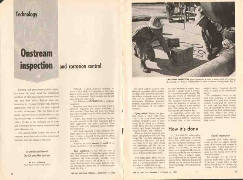 Original old petroleum trade magazine vintage article titled ONSTREAM INSPECTION and Corrosion Control by H.C. Bozeman, Gulf Coast Engineering Editor.