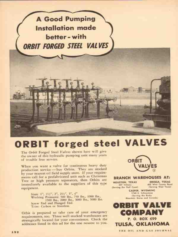 Original oil and gas trade magazine vintage ad for ORBIT VALVE COMPANY of Tulsa, OK. A Good Pumping Installation Made Better with Orbit Forged Steel Valves. Unique 1954 old oilfield petroleum well industry steel valve equipment magazine advertisement.