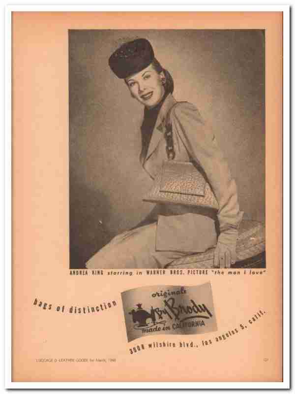 Original 1946 leather handbag manufacturing trade magazine vintage ad for ORIGINALS BY BRODY. Main office was located at 3908 Wilshire Blvd., Los Angeles, CA. Photo of Andrea King, starring in Warner Bros. Picture "the man I love". Bags of Distinction. Made in California. This old dated one page magazine advertisement would display beautifully matted and framed.