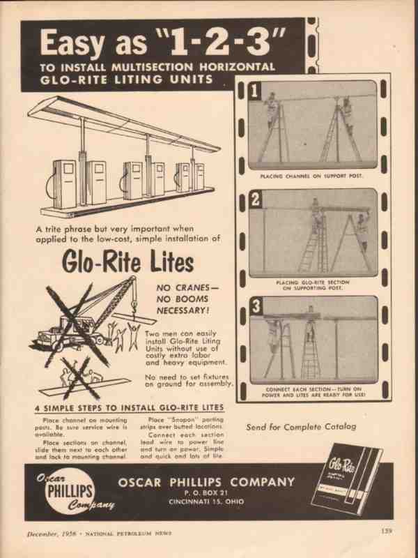 Original old service station trade magazine vintage ad for OSCAR PHILLIPS COMPANY of Cincinnati, OH. Glo-Rite Lites Multi Sectional Horizontal Lifting Unit. This unique old 1956 electrical lighting advertisement would display beautifully matted and framed.