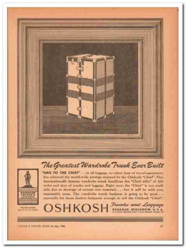 Original luggage trade magazine vintage ad for OSHKOSH TRUNKS & LUGGAGE COMPANY. Main office and plant was located in Oshkosh, WI. Also was located at 10 East 34th Street, New York City, NY., and at 512 South Peoria Street, Chicago, IL. The Greatest Wardrobe Trunk Ever Built. Hail To The Chief. Right now, the Chief is not available due to shortage of certain raw materials, but it will be with you, reasonably soon. This unique 1946 old luggage industry magazine advertisement would display wonderful matted and framed. Nice graphics.