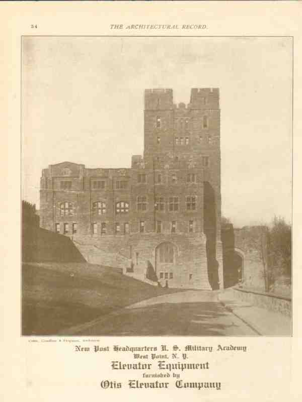 Original vintage architectural trade magazine ad for OTIS ELEVATOR COMPANY. New Post Headquarters of the U.S. Military Academy, West Point, New York. Elevator Equipment furnished by Otis Elevator Company. Cram, Goodhue and Ferguson, Architects. Old 1911 building construction industry advertisement.