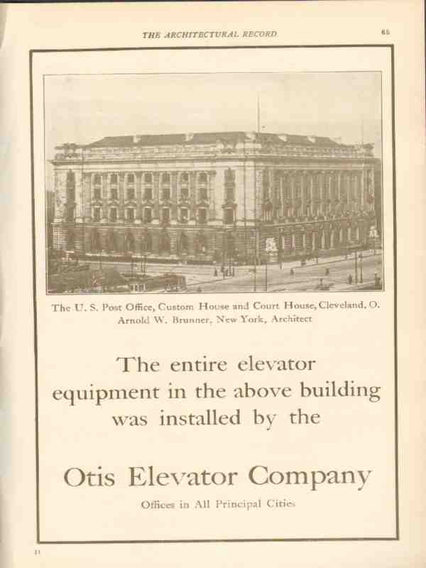 Original vintage architectural trade magazine ad for OTIS ELEVATOR COMPANY. The U.S. Post Office, Custom House and Court House, Cleveland, OH all elevator equipment installed by the Otis Elevator Company. Arnold W. Brunner, Architect. Old 1911 building construction industry advertisement.