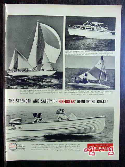 Original vintage magazine ad, OWENS CORNING FIBERGLAS BOATS, "The Strength and safety of FIBERGLASS Reinforced Boats!" Outboards, sailing boats, cruising boats, small craft. Old 1959 magazine boat advertisement. Would look fantastic matted and framed!
