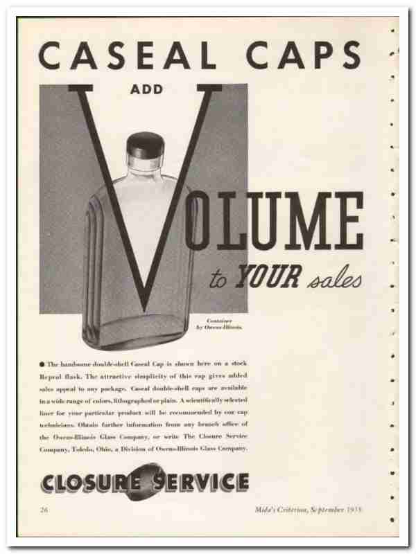 Owens-Illinois Glass Company 1935 vintage ad Caseal Caps volume sales