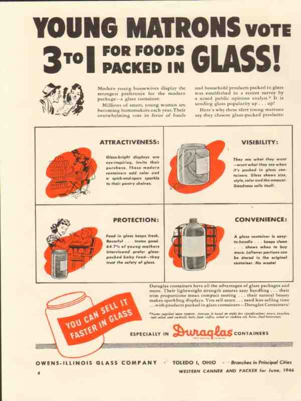 Original vintage food packaging trade magazine ad for OWENS-ILLINOIS GLASS COMPANY of Toledo, OH. Young Matrons Vote 3 to 1 For Foods Packed in Glass! Modern young housewives display the strongest preference fore the modern package, a glass container. Especially Duraglas Containers. Old 1946 glass packer advertisement