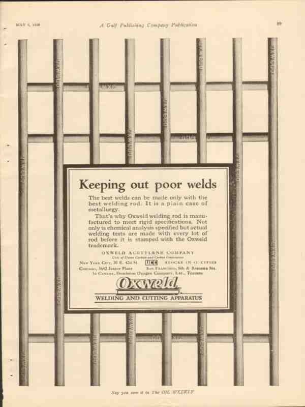 Original oil and gas trade magazine vintage ad for OXWELD ACETYLENE COMPANY of New York City, NY. Keeping Out Poor Welds with the Oxweld Welding Rod. Old 1928 petroleum industry oilfield and refinery advertisement.