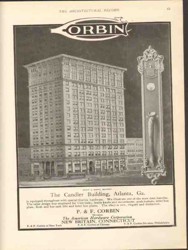 Original vintage architectural trade magazine ad for P. & F. CORBIN, Division of The American Hardware Corporation of New Britain, Ct. The Candler Building in Atlanta, GA is equipped throughout with Special Corbin Hardware. Door Handles, Knobs, Push Buttons, Letter Box Plate, Flush and Bar Sash Lifts. The effect is rich, elegant and distinctive. George E. Murphy, Architect. Old 1912 building hardware advertisement.