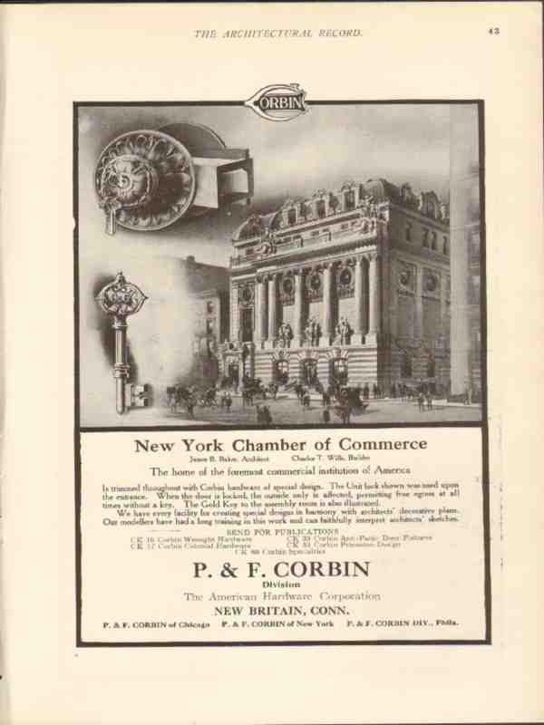 Original vintage architectural trade magazine ad for P. & F. CORBIN of New Britain, CT. The New York Chamber of Commerce is trimmed throughout with Corbin hardware of special design. The Unit lock shown was used upon the entrance. The Gold Key to the Assembly Room is also shown. Old 1912 construction industry advertisement would display beautifully matted and framed.