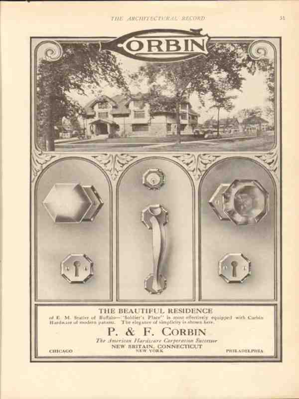 Original vintage architectural trade magazine ad for P. AND F. CORBIN of New Britain, CT. The Beautiful Residence of E. M. Statler of buffalo, Soldier's Place is equipped with Corbin Hardware. Door knobs, latches, locks, handles. Old 1913 building construction hardware advertisement.