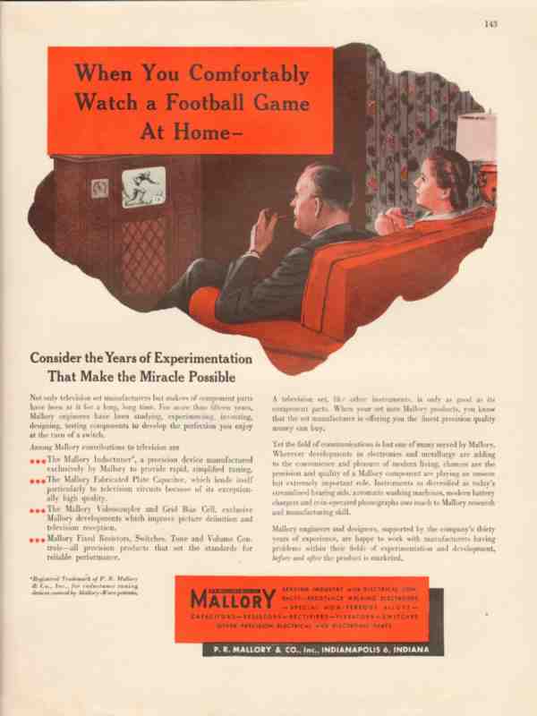 Original old electronic components industry trade magazine vintage ad for P.L R. MALLORY AND COMPANY, INC. of Indianapolis, IN. When you Comfortable Watch a Football Game at Home, Consider the Years of Experimentation That Make the Miracle Possible. Mallory Inductuner, Fabricated Plate Capacitor, Videocoupler and grid Bias Cell, Resistors, Switches, Resister, Tone and Volume Controls. This 1947 industry magazine advertisement would display beautifully matted and framed.