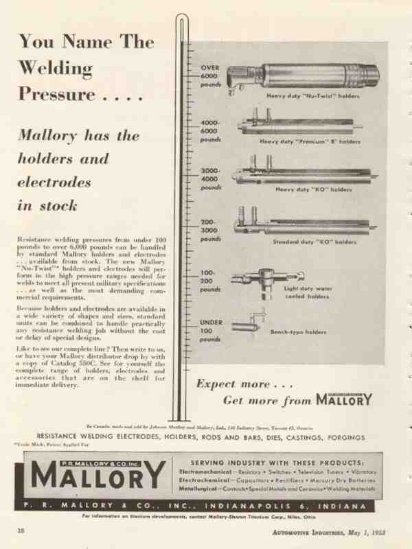 Original vintage automotive industries trade magazine ad for P.R. MALLORY, INC of Indianapolis, IN. You Name The Welding Pressure, Mallory Has the Holders and Electrodes in Stock. Nu-Twist, Premium 8, KO Holders. Old 1953 industrial advertisement.