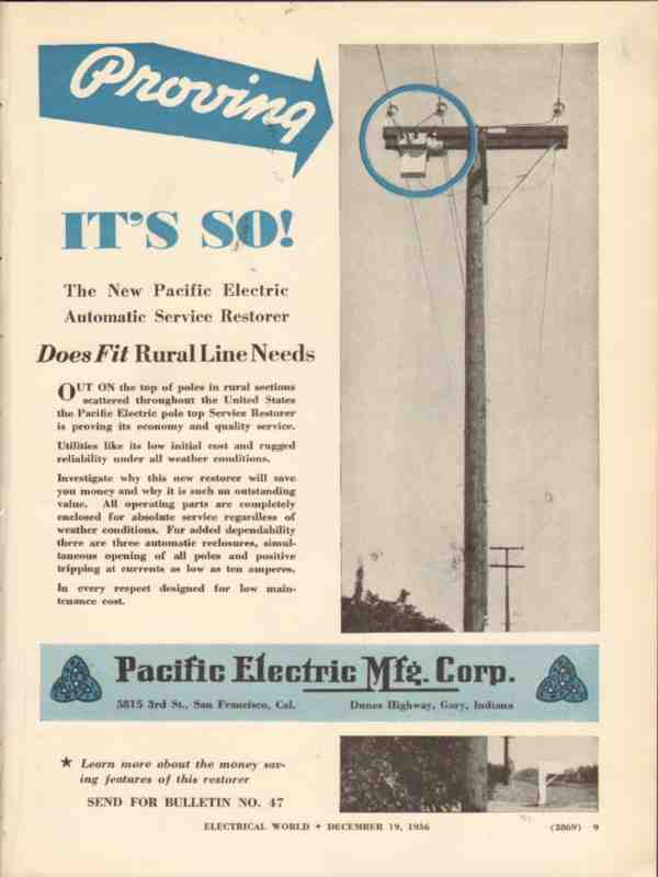Original old electrical power industry trade magazine ad for PACIFIC ELECTRIC MANUFACTURING CORPORATION of San Francisco, CA. Proving It's So! The New Pacific Electric Automatic Service Restorer Does Fit Rural Line Needs. This 1936 industry magazine advertisement would display beautifully matted and framed.