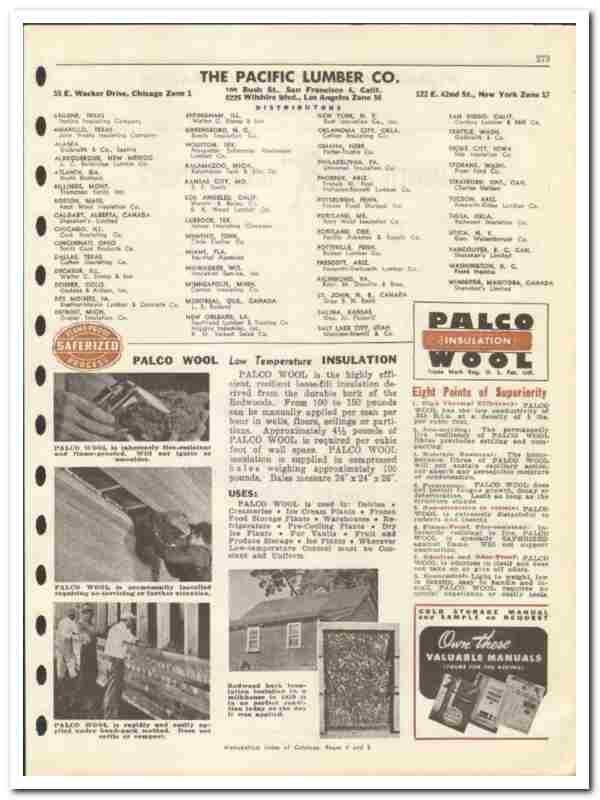 Original 1946 insulation trade vintage catalog for the PACIFIC LUMBER COMPANY. Main office was located at 100 Bush Street, San Francisco, CA. Alos located at 35 East Wacker Drive, Chicago, IL, at 5225 Wilshire Blvd, Los Angeles, CA, and at 122 East 42nd Street, New York, NY.