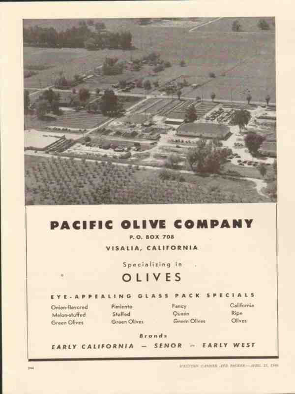 Original vintage food packaging trade magazine ad for PACIFIC OLIVE COMPANY of Visalia, CA. Specializing in Olives, Brands are Early California, Senor, Early West. Eye-Appealing Glass Pack Specials. Pictured is the processing plant in Visalia, California. Old 1946 food service canning and processing advertisement.