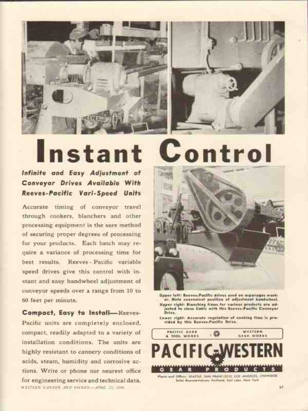 Original vintage food packing industry trade magazine ad for PACIFIC-WESTERN GEAR PRODUCTS of Seattle, WA. Instant Control Infinite and Easy Adjustment of Conveyor Drives Available with Reeves-Pacific Vari-Speed Units. Old 1946 canning and processing equipment advertisement.
