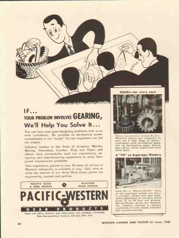 Original vintage food packing trade magazine ad for PACIFIC-WESTERN GEAR PRODUCTS of Seattle, WA, San Francisco and Los Angeles, CA. If Your Problem Involves Gearing, We'll Help You Solve It. Gear Tool and Works. Aviation, Marine, Mining, Petroleum, Lumber, Pulp and Paper Industries Successfully used our Engineering, Designing and manufacturing Experience. Old 1946 canning industry advertisement.