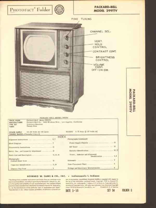 Vintage PACKARD-BELL model 2991TV 29 tube TV television receiver. Original old Sams Photofact manual includes schematic, layout, voltage & resistance test charts, repair parts list. 20 pages. Dated 1950. Packard-Bell Electronics Corp., of Los Angeles, CA. This manual would make a sensational accompaniment to your vintage video TV equipment.