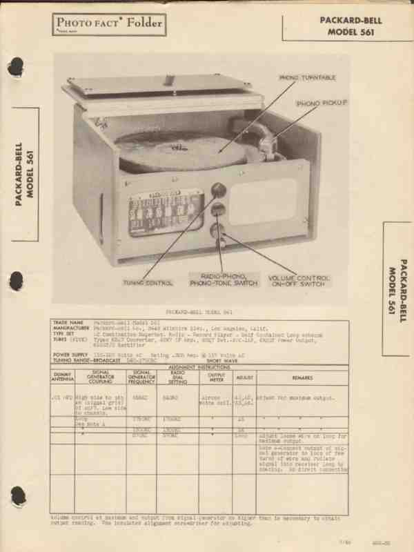 Vintage PACKARD-BELL model 561 combination Superheterodyne 5 tube AM radio receiver with phonograph record player. Original old Sams Photofact manual includes schematic, layout, alignment instructions, voltage & resistance test charts, repair parts list and description. Dated 1946. 4 pages. Packard Bell Electronics Corp., of Los Angeles, CA. This manual would make a sensational accompaniment to your classic retro radio equipment.
