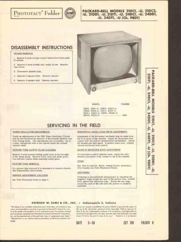 Vintage PACKARD-BELL models 21DC1, 21DC1U, 21DC2, 21DC2U, 21DD1, 21DD1U, 21DT1, 21DT1U, 24DC1, 24DC1U, 24DD1, 24DD1U, 24DT1 and 24DT1U (chassis 98D1) TV television receiver. Original old Sams Photofact manual includes schematic, layout, alignment instructions, voltage & resistance test chart, repair parts list and description. 16 pages. Dated 1956. This manual would make a sensational accompaniment to your classic video TV equipment.