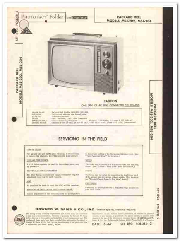 Vintage PACKARD BELL models MSJ-202 and MSJ-204 AC operated fourteen tube VHF and one transistor UHF TV television receiver. Channels 2-13 VHF and 14-83 UHF. Original old Sams Photofact manual includes schematics, parts layout and photographs, tube failure check chart, alignment instructions, resistance measurement test chart, repair parts list and description. 16 pages. Dated 6-1967. This manual would make a sensational accompaniment to your retro television equipment.