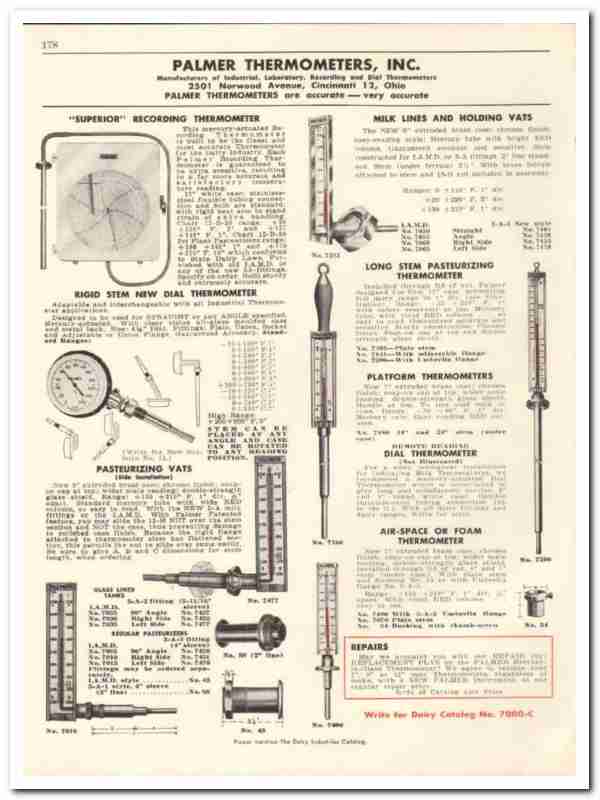 Original dairy trade vintage catalog for PALMER THERMOMETERS, INC. Main office and plant was located at 2501 Norwood Avenue, Cincinnati, Ohio.