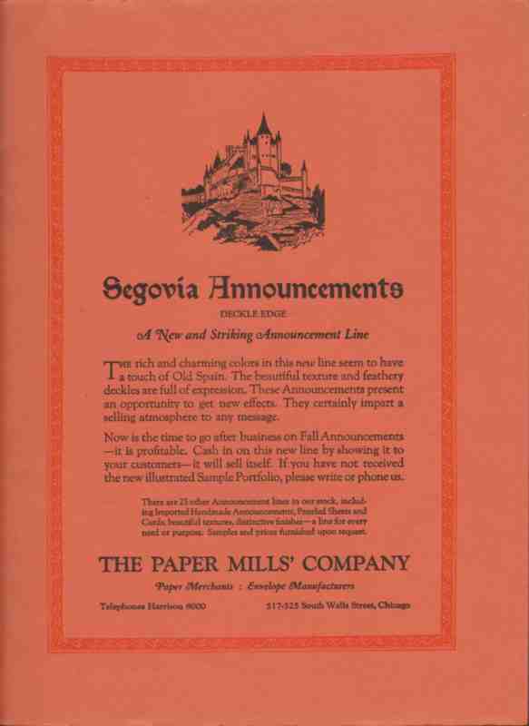 Original old printing magazine vintage ad for PAPER MILLS COMPANY in Chicago, IL. Segovia Announcements with deckle edge, a new and striking announcement line. The rich and charming colors in this line seem to have a touch of Old Spain. Was located at 517-525 South Wells Street. This 1926 unique one page print industry trade advertisement would display beautifully matted and framed.