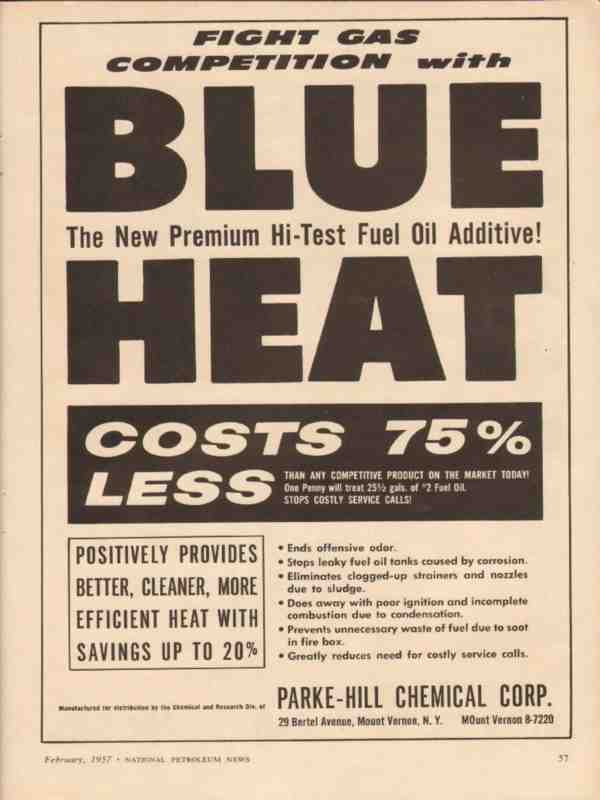 Original oil and gas trade magazine vintage ad for PARKE-HILL CHEMICAL CORPORATION, was located at 29 Bartel Avenue, Mount Vernon, NY. Blue Heat Premium Hi-Test Fuel Oil Additive. This unique 1957 old fuel oil industry additive magazine advertisement would display beautifully matted and framed. Nice graphics.