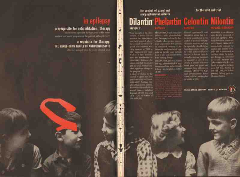 Original old medical doctor pharmaceutical trade magazine vintage ad for PARK DAVIS COMPANY of Detroit, MI. In Epilepsy for control of grand mal and psychomotor seizures, Dilatin, Phelantin, Celontin, Milontin. This 1959 gatefold magazine advertisement would display beautifully matted and framed.