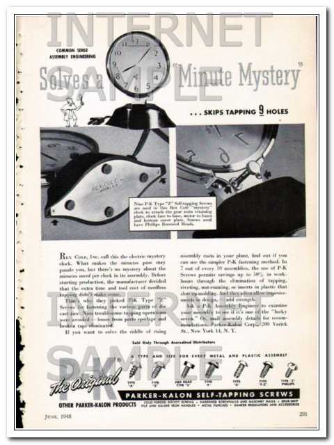 Original vintage industrial magazine ad for PARKER-KALON CORPORATION of New York City, NY. Common Sense Assembly Engineering Solves a Minute Mystery, skips Tapping 9 Holes. Nine P-K Type Z Self Tapping Screws used in this Rex Cole Inc. Mystery. Old 1948 industry advertisement. Would display magnificently matted and framed!