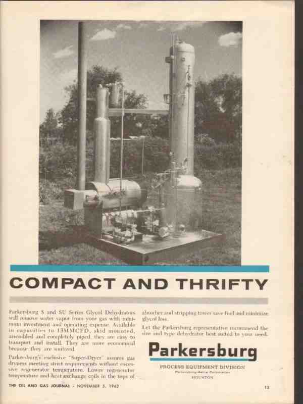 Original oil and gas trade magazine vintage ad for THE PARKERSBURG-AETNA CORPORATION of Houston, TX.  Compact and Thrifty.  Parkersburg S and SU Series Glycol Dehydrators Will remove Water Vapor From Your Gas with Minimum Investment and Operating Expense. This unique 1962 old petroleum refinery industry equipment magazine advertisement would display beautifully matted and framed.