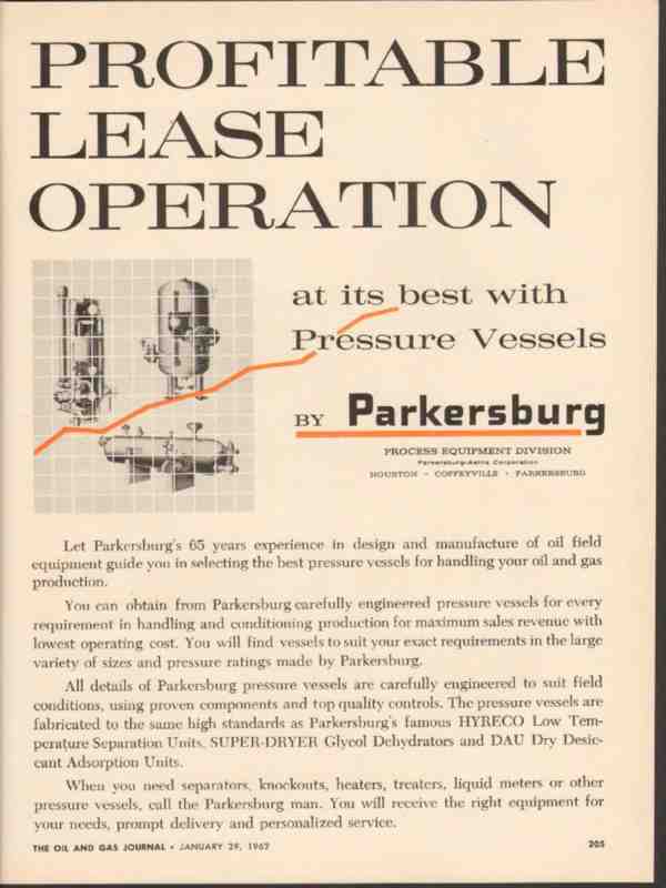 Original oil and gas trade magazine vintage ad for THE PARKERSBURG-AETNA CORPORATION of Houston, TX.  Profitable Lease Operation At Its Best with Pressure Vessels by Parkersburg.  Process Equipment Division. This unique 1962 old petroleum refinery equipment magazine advertisement would display beautifully matted and framed.