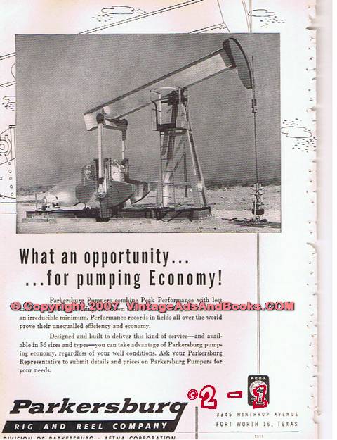 Original oil and gas trade magazine vintage ad for THE PARKERSBURG RIG & REEL COMPANY. Division of Parkersburg - Aetna Corporation. Main office and factory was located at 3345 Winthrop Avenue, Fort Worth, TX. What an Opportunity for Pumping Economy! Parkersburg Pumpers combine Peak Performance with less maintenance, less servicing, less down time to bring lifting costs down to an irreducible minimum. This unique 1955 old oilfield petroleum well pumping industry equipment magazine advertisement would look fantastic matted and framed. Approximate size 9 x 12 inches.