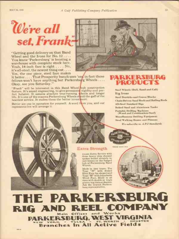 Original oil and gas trade magazine vintage ad for THE PARKERSBURG RIG & REEL COMPANY of Parkersburg, WV.  We're All Set Frank Getting Good Delivery on that Band Wheel and the Irons for No. 12.  Steel wheels, rig irons, steel derricks and crown blocks, bolted steel and aluminum tanks.  Unique 1930 old oilfield petroleum drilling industry equipment magazine advertisement. Nice graphics.