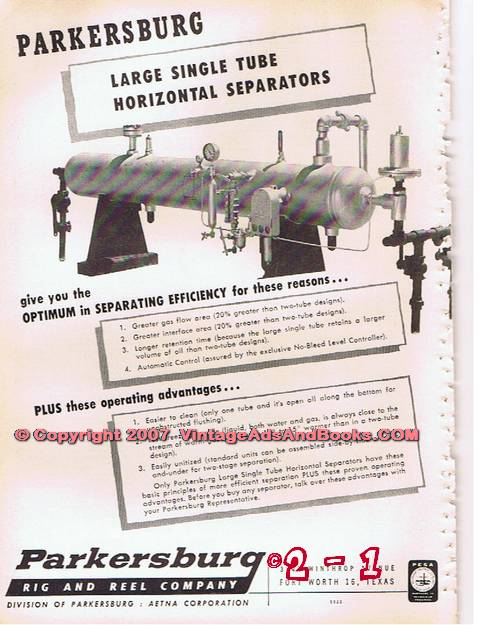 Original oil and gas trade magazine vintage ad for THE PARKERSBURG RIG & REEL COMPANY. Division of Parkersburg - Aetna Corporation. Main office and plant was located at 3345 Winthrop Avenue, Fort Worth, TX. Parkersburg Large Single Tube Horizontal Separators. Unique 1955 old petroleum refining equipment industry magazine advertisement.