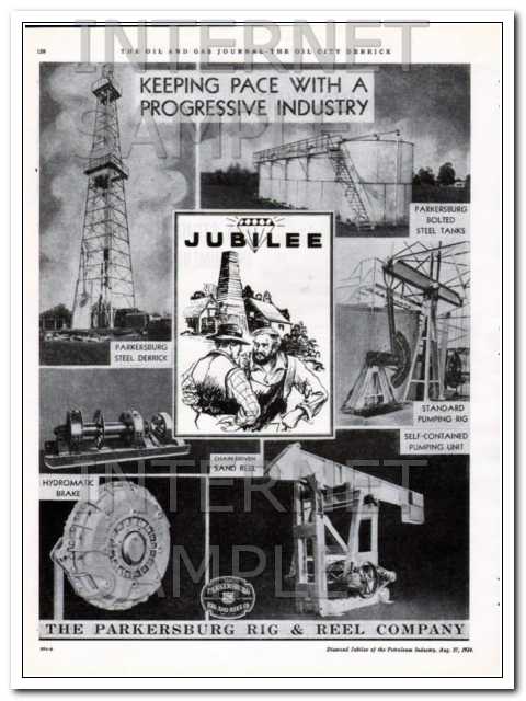 Original oil and gas trade magazine vintage ad for THE PARKERSBURG RIG & REEL COMPANY of Parkersburg, WV.  Keeping Pace With A Progressive Industry.  Jubilee. Parkersburg Bolted Steel Tanks, Standard Pumping Rig, Self Contained Pumping Unit, Chain Driven Sand Reel, Hydromatic Brake and Parkersburg Steel Derrick. This unique 1934 old oilfield petroleum well drilling and pumping industry equipment magazine advertisement would look sensational matted and framed. Nice graphics. Approximate size  10  x 13 inches.