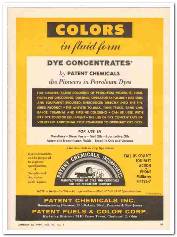 Original oil and gas trade magazine vintage ad for PATENT CHEMICALS, INC. of Cincinnati, Ohio. Manufacturing Division was located at 335 McLean Blvd, Paterson, NJ. Colors in fluid form dye concentrates. For cleaner, easier coloring of petroleum products, eliminates pre-dissolving, dusting, operator exposure. For use in gasolines, diesel fuels, fuel and lubricating oils, automatic transmission fluids, break-in greases. This unique 1959 old petroleum refining and processing additive trade magazine advertisement would display beautifully matted and framed.