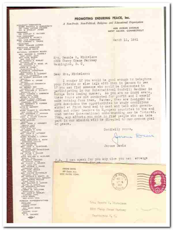 Hard covered book titled PEACE, WAR AND YOU by Jerome Davis, 1952, with a letter from the Author postmarked 1961, 282 pages.